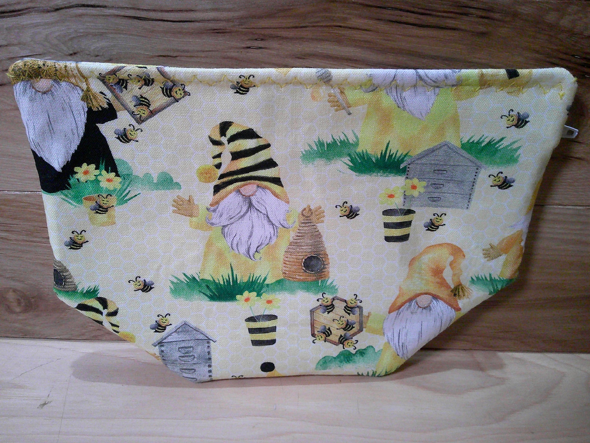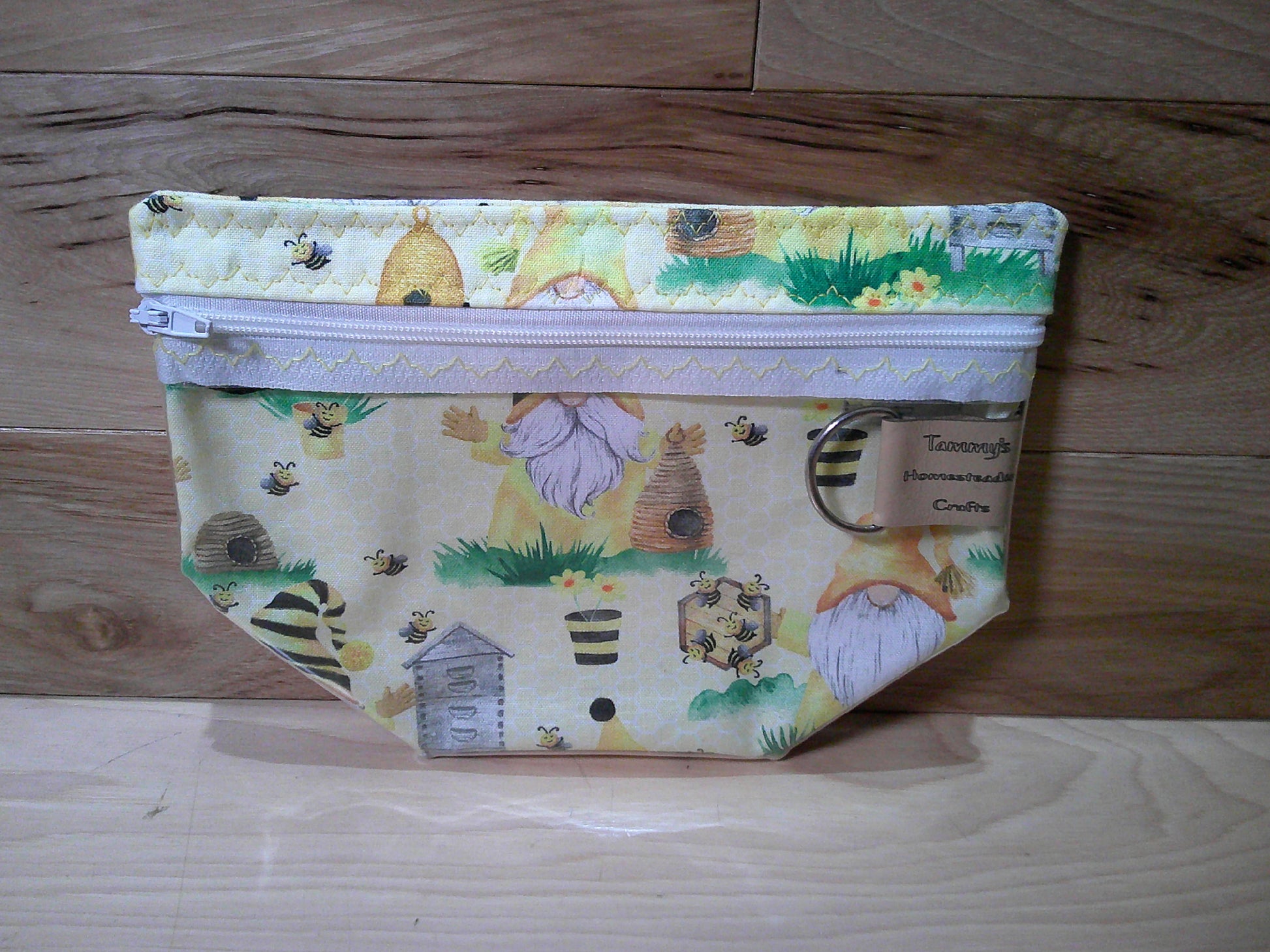 The small notions size bag to keep things like scissors, stitch markers, progress keepers, tape measure and other little things you might need for your projects. There is a D-ring on the inside to hold stitch markers. This bag has a zipper on the front top and a vinyl front so you can see what is in your bag.