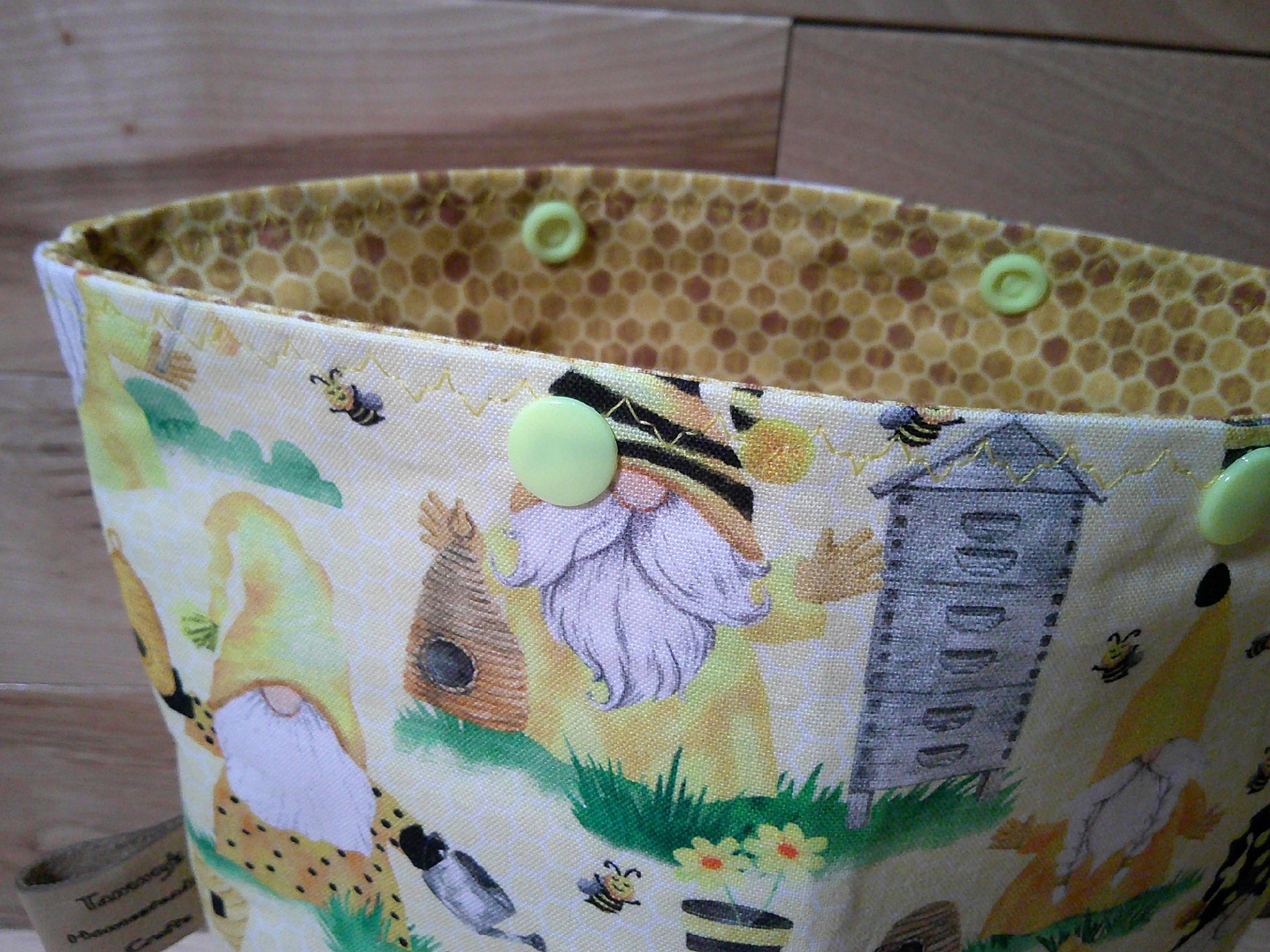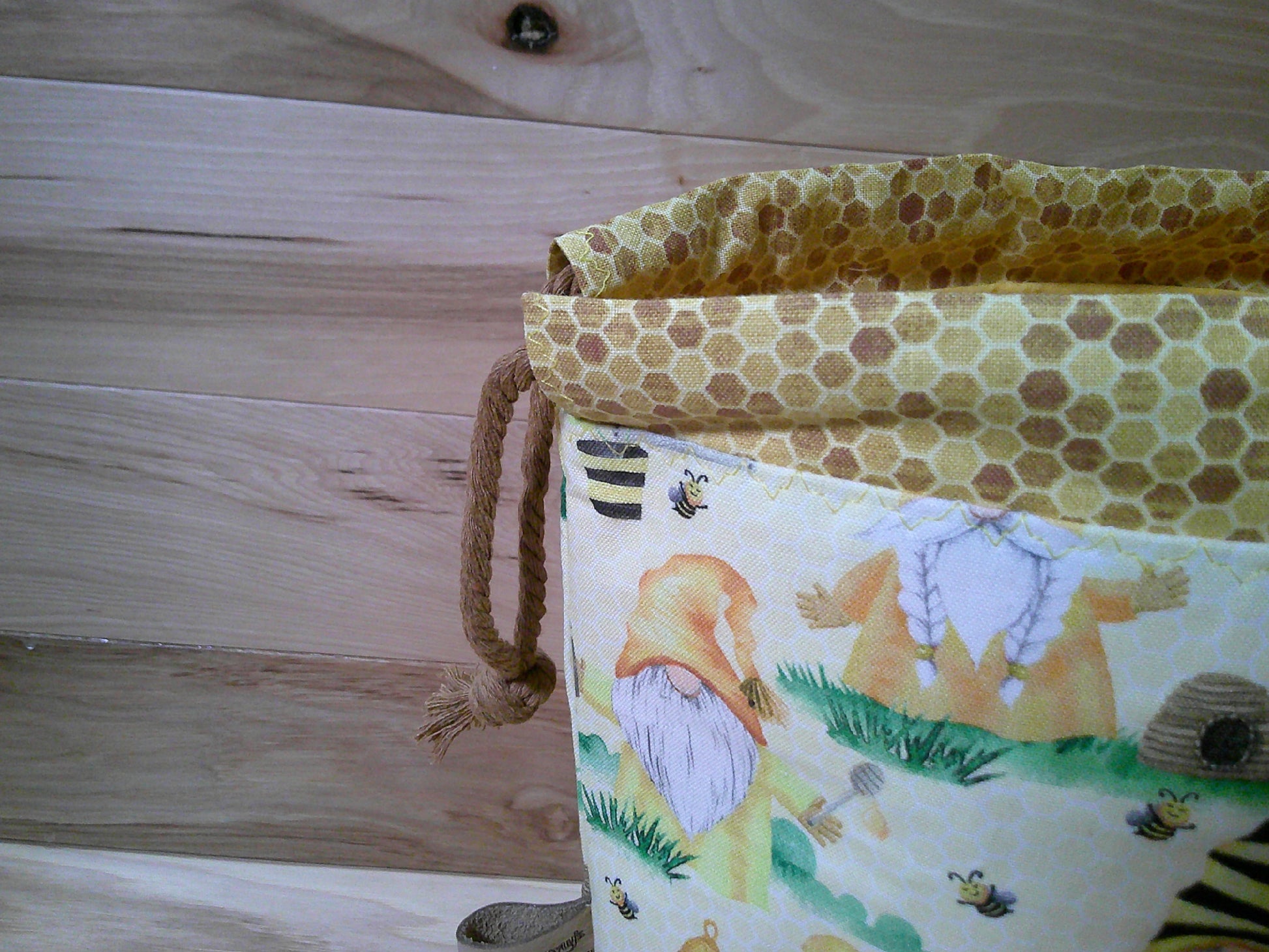 The medium drawstring bag has 2 drawstrings that can be pulled from both sides to close the bags. This bag has a stitch marker ring on the inside of the bag. The bag is fully lined with medium weight interfacing between to allow it to stand upright.