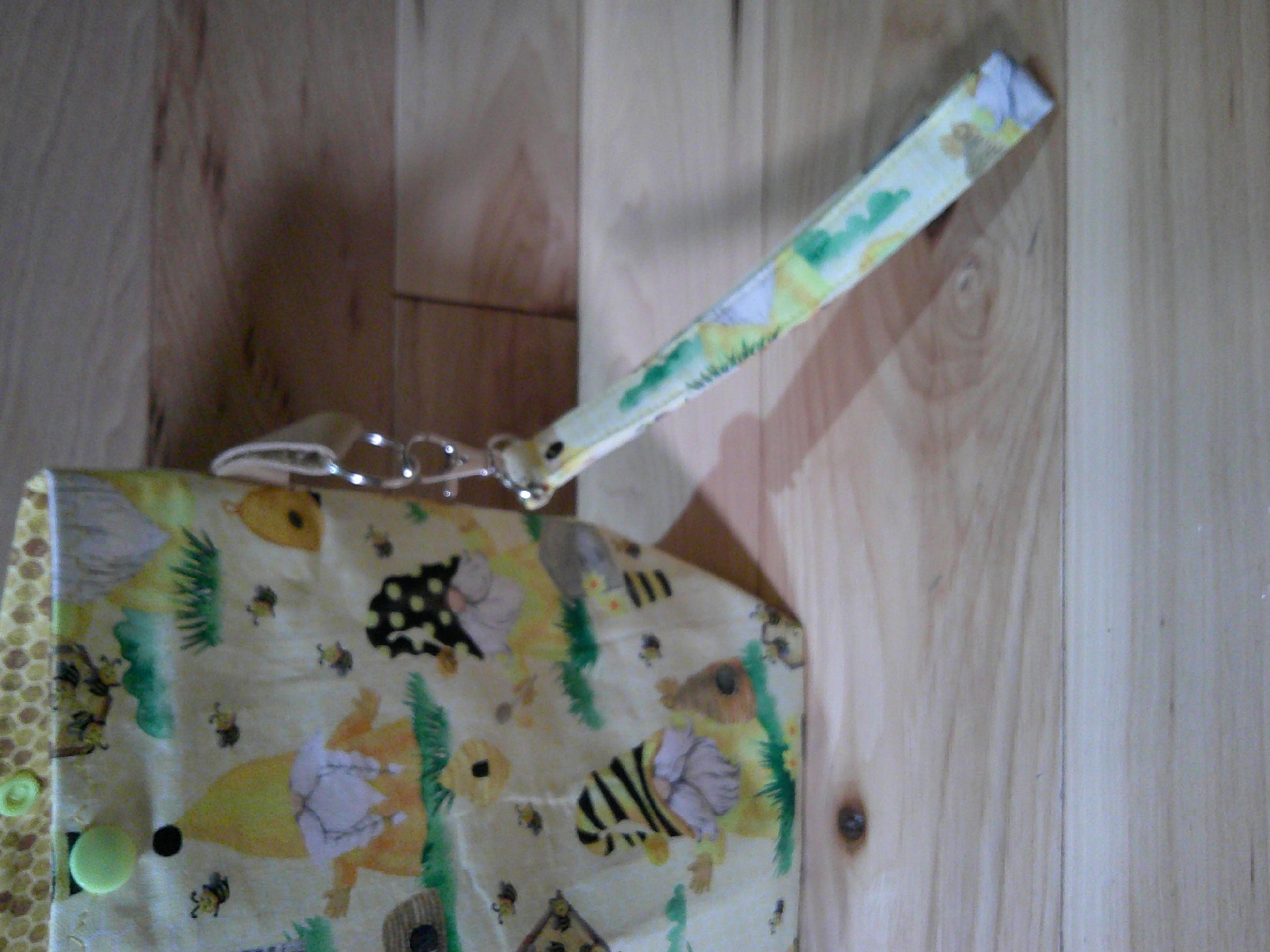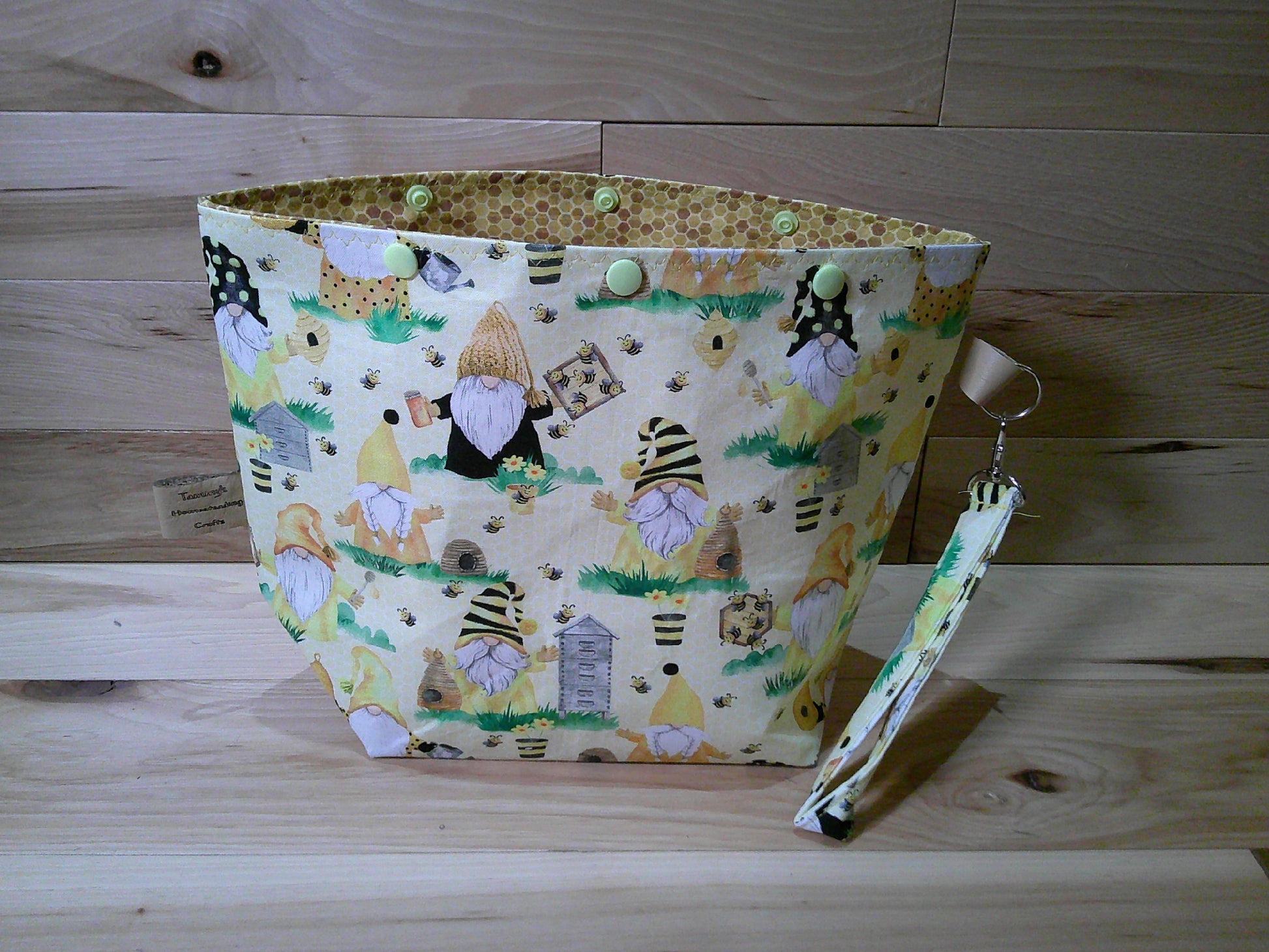 The medium size bag has snaps on the top to allow you to keep your items securely inside the bag. There is a key ring inside to keep progress keepers and stitch markers on. On the outside there is a key ring tag with a lobster clasp wristlet. The bag is fully lined with medium weight interfacing between to allow it to stand upright.