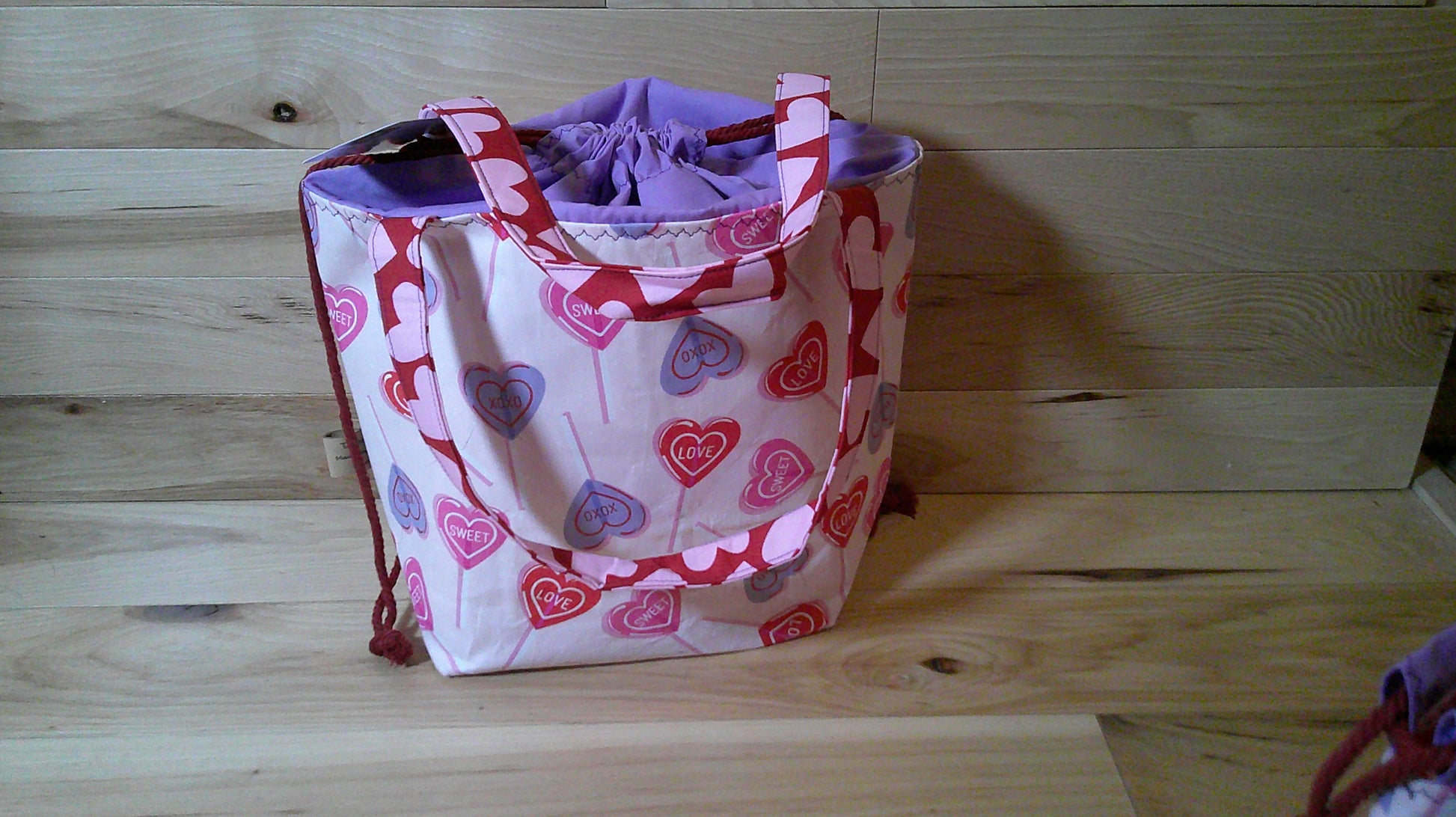 The medium drawstring bag has 2 drawstrings that can be pulled from both sides to close the bags. This bag has a stitch marker ring on the inside of the bag. The bag is fully lined with medium weight interfacing between to allow it to stand upright.