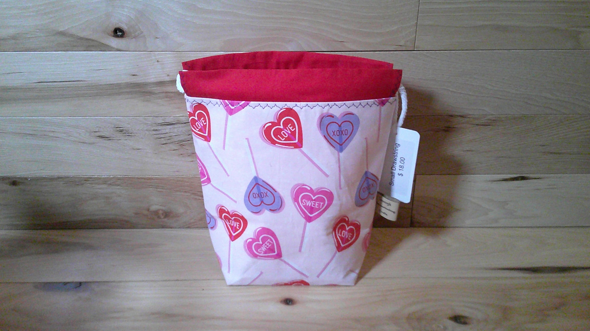 The small drawstring bag has 2 drawstrings that can be pulled from both sides to close the bags. This bag has a stitch marker ring on the inside of the bag. The bag is fully lined with medium weight interfacing between to allow it to stand upright.