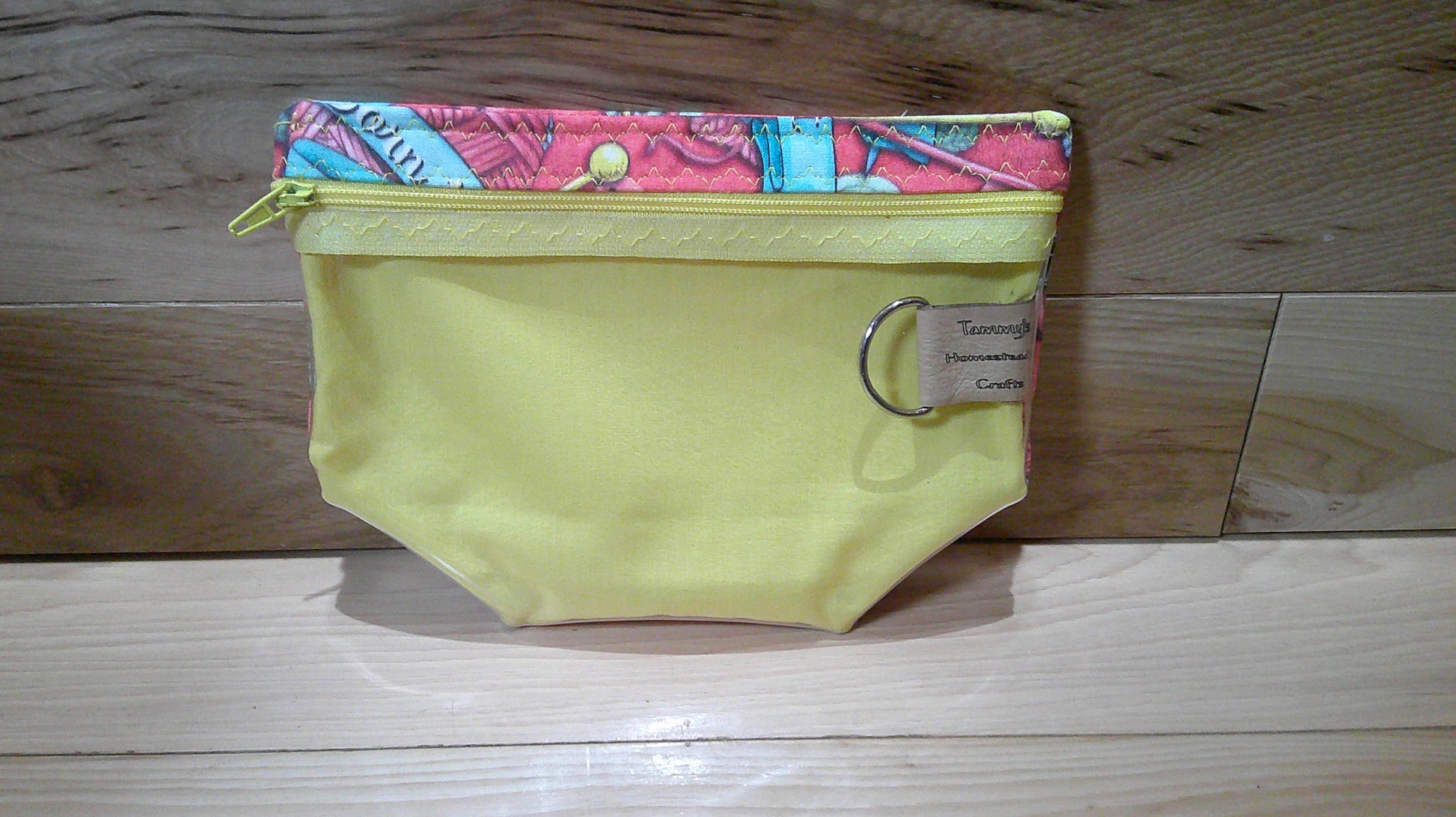 The small notions size bag to keep things like scissors, stitch markers, progress keepers, tape measure and other little things you might need for your projects. There is a D-ring on the inside to hold stitch markers. This bag has a zipper on the front top and a vinyl front so you can see what is in your bag.