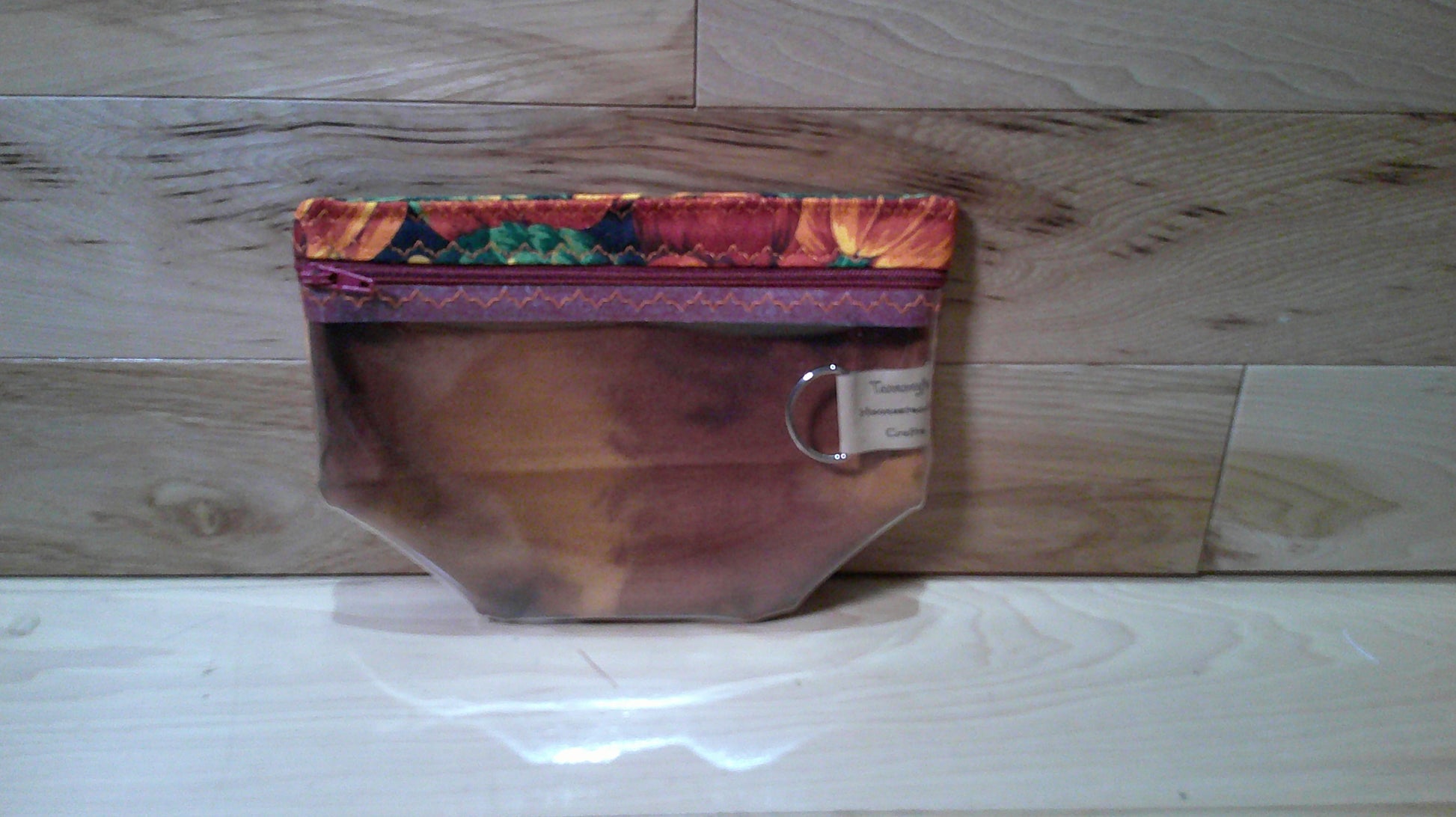 The small notions size bag to keep things like scissors, stitch markers, progress keepers, tape measure and other little things you might need for your projects. There is a D-ring on the inside to hold stitch markers. This bag has a zipper on the front top and a vinyl front so you can see what is in your bag.