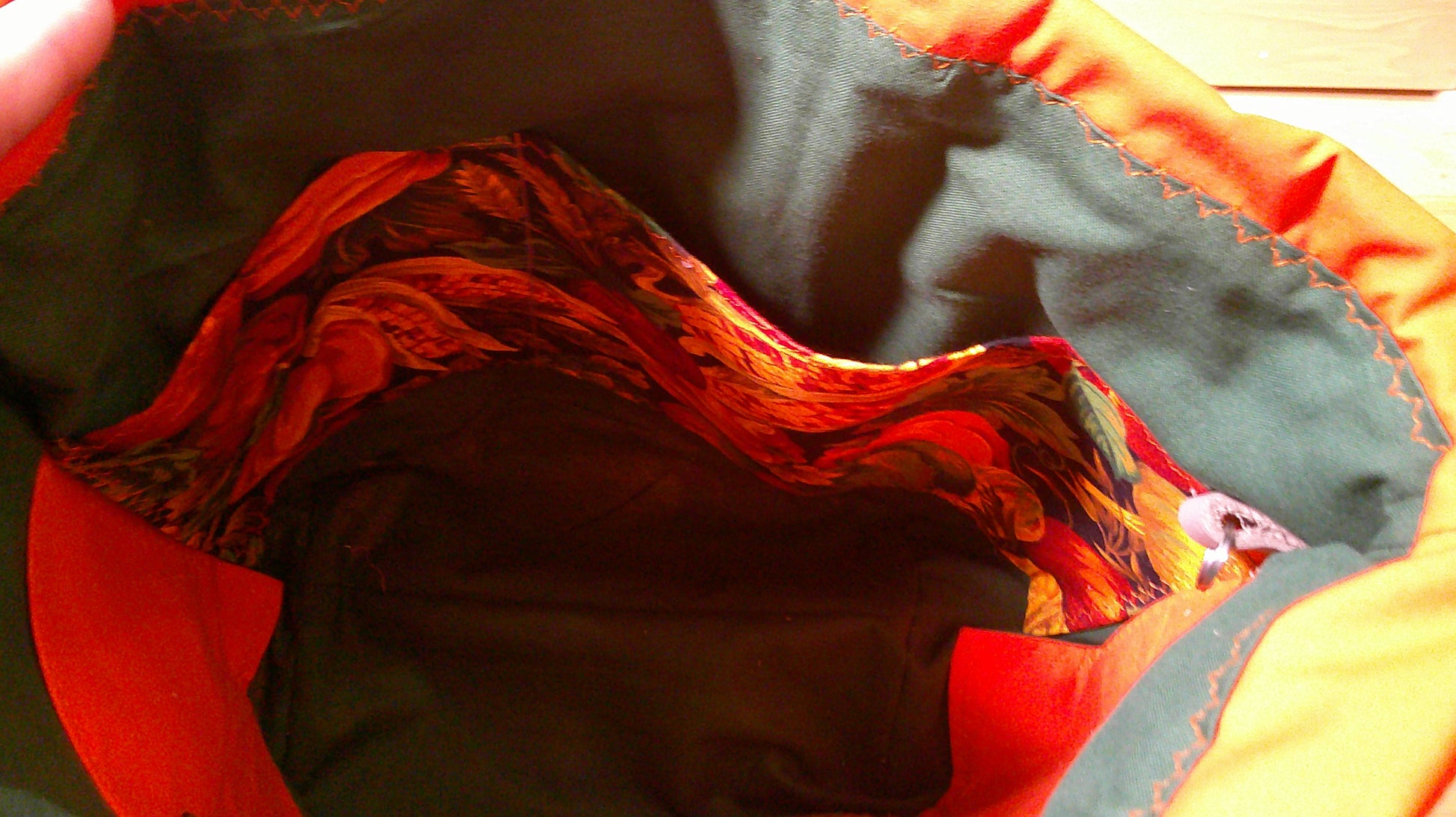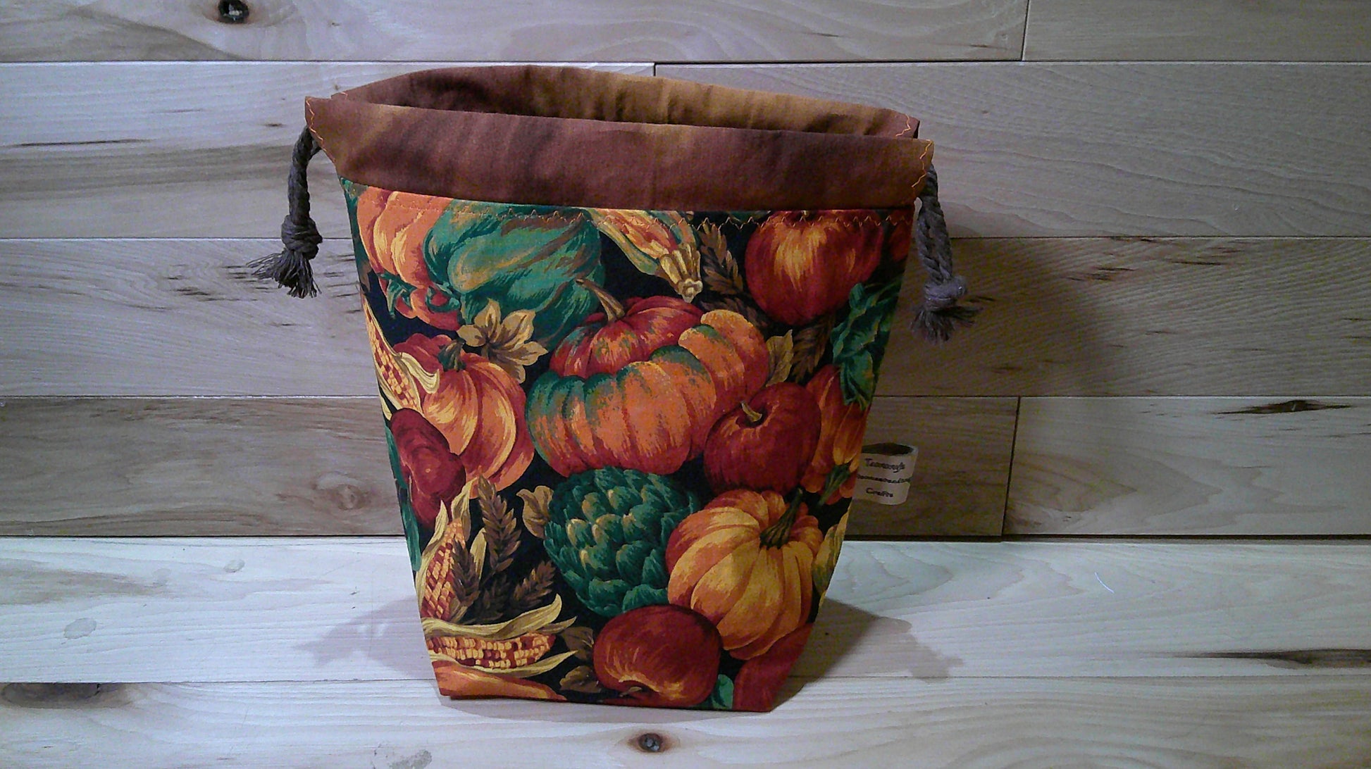 The Large bag size has sewn in handles and a 4-inch top gusset with drawstring for closure. There is a key ring inside to keep progress keepers and stitch markers on. The drawstrings are long enough so you are able to roll the extra top fabric down to make a yarn bowl bag for knitting or crocheting out of. The bag is fully lines with medium weight interfacing between to allow is to stand upright. This bag has 5 pockets on the inside of the bag that are sturdy and make the bag nice and firm.