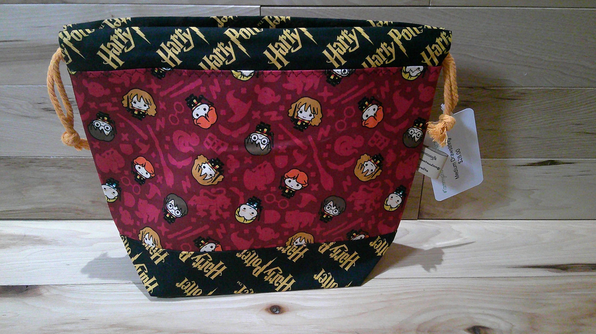 The medium drawstring bag has 2 drawstrings that can be pulled from both sides to close the bags. This bag has a stitch marker ring on the inside of the bag. The bag is fully lined with medium weight interfacing between to allow it to stand upright.