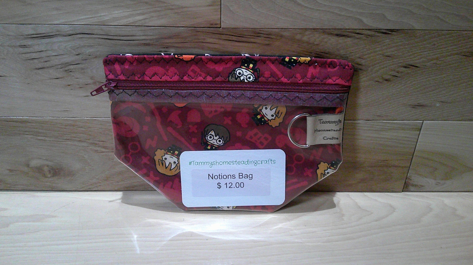 The small notions size bag to keep things like scissors, stitch markers, progress keepers, tape measure and other little things you might need for your projects. There is a D-ring on the inside to hold stitch markers. This bag has a zipper on the front top and a vinyl front so you can see what is in your bag.