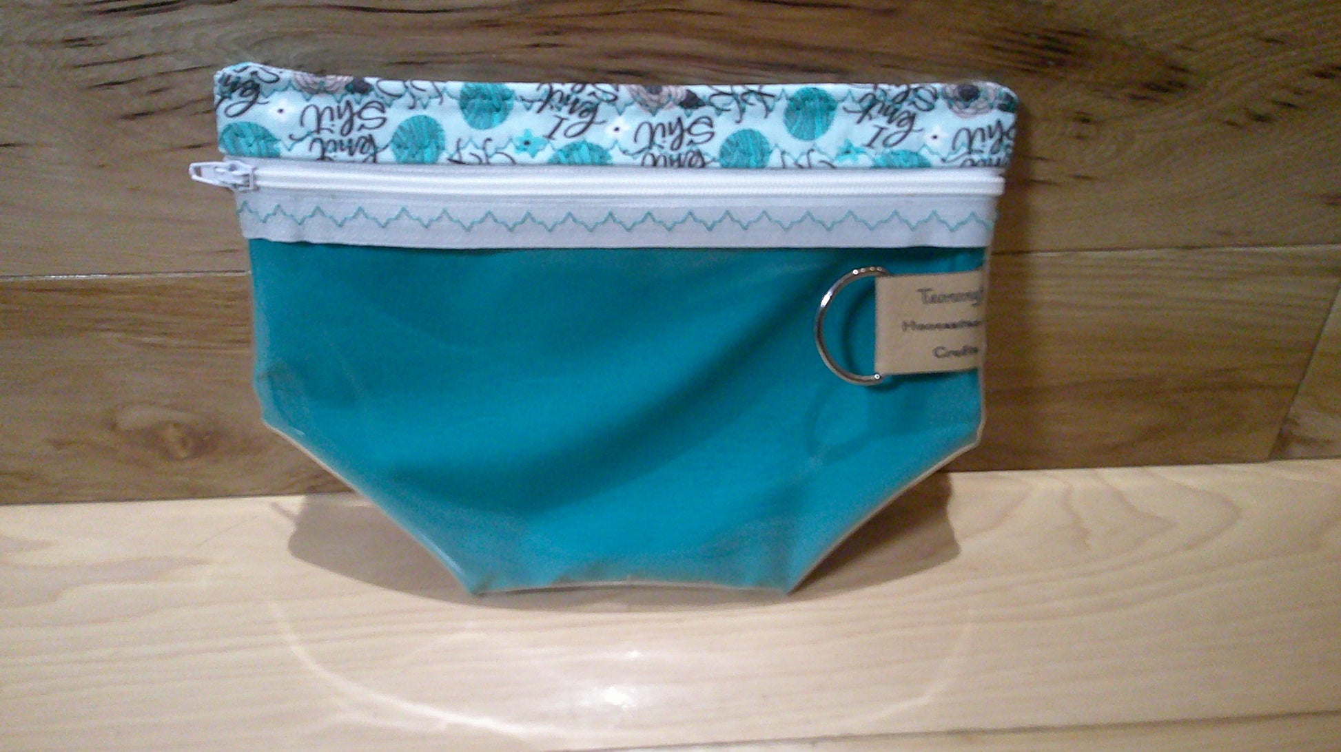 The small notions size bag to keep things like scissors, stitch markers, progress keepers, tape measure and other little things you might need for your projects. There is a D-ring on the inside to hold stitch markers. This bag has a zipper on the front top and a vinyl front so you can see what is in your bag.