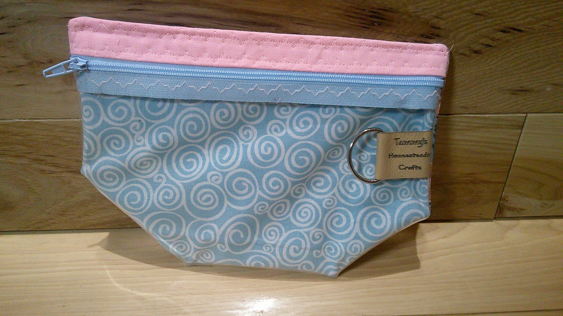 The small notions size bag to keep things like scissors, stitch markers, progress keepers, tape measure and other little things you might need for your projects. There is a D-ring on the inside to hold stitch markers. This bag has a zipper on the front top and a vinyl front so you can see what is in your bag.