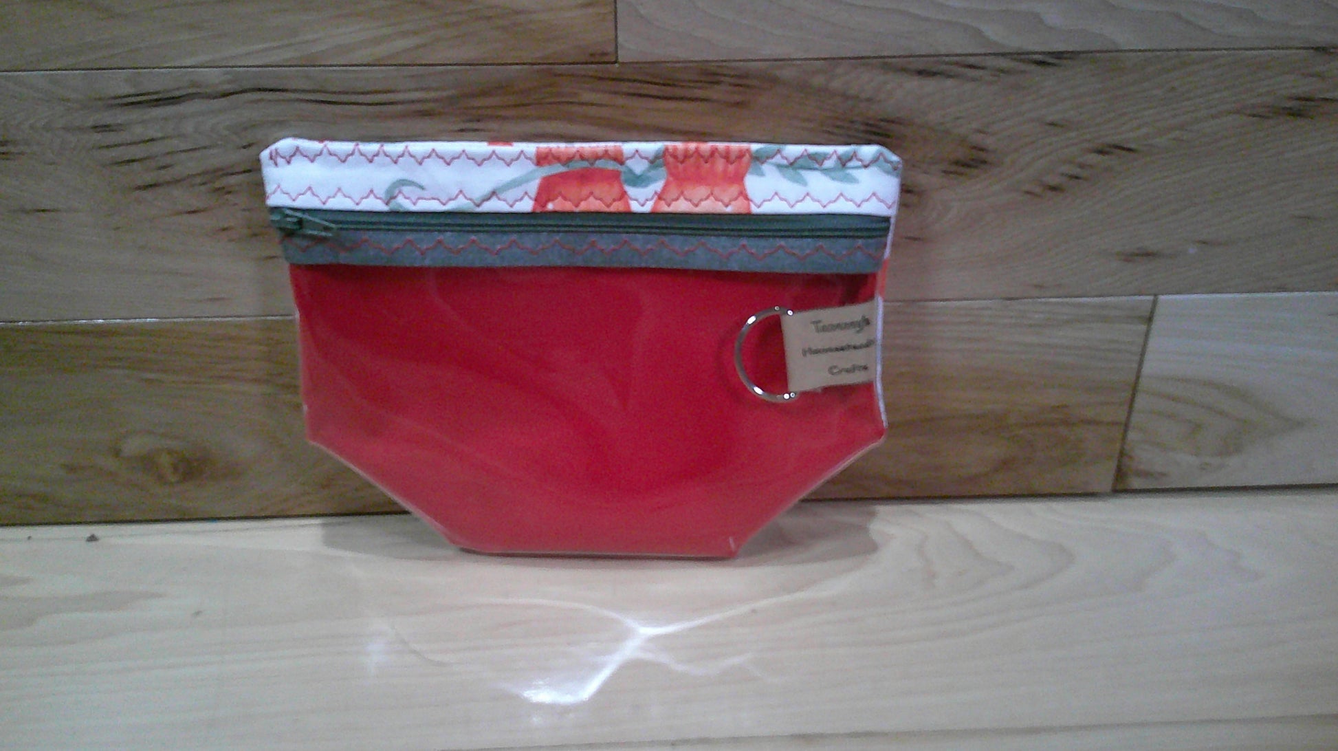 The small notions size bag to keep things like scissors, stitch markers, progress keepers, tape measure and other little things you might need for your projects. There is a D-ring on the inside to hold stitch markers. This bag has a zipper on the front top and a vinyl front so you can see what is in your bag.
