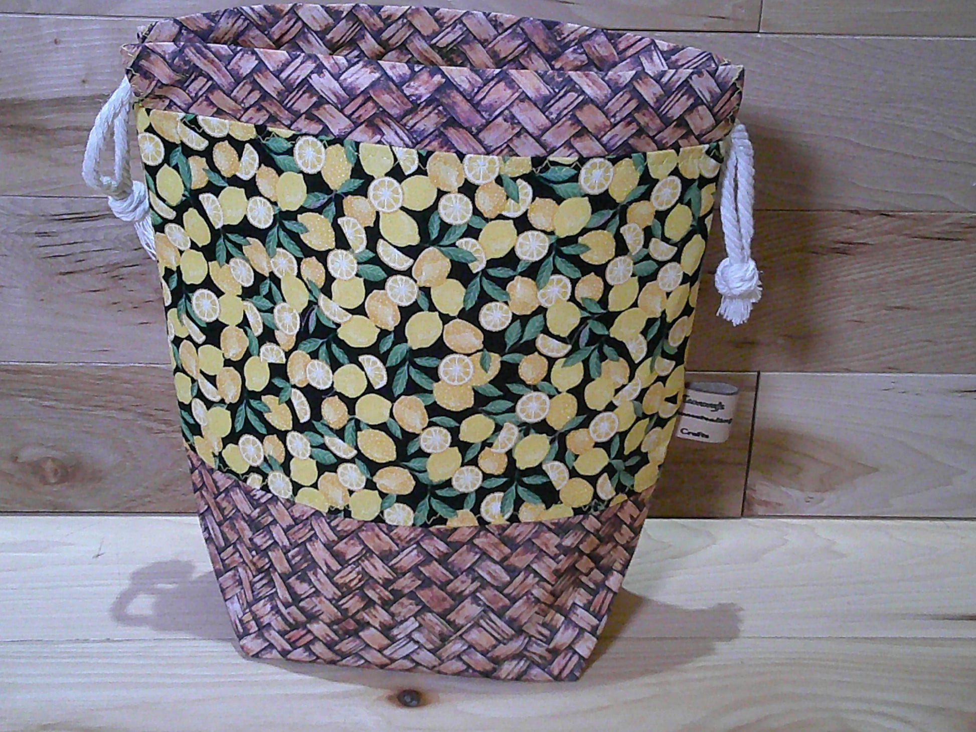 The medium drawstring bag has 2 drawstrings that can be pulled from both sides to close the bags. This bag has a stitch marker ring on the inside of the bag. The bag is fully lined with medium weight interfacing between to allow it to stand upright.