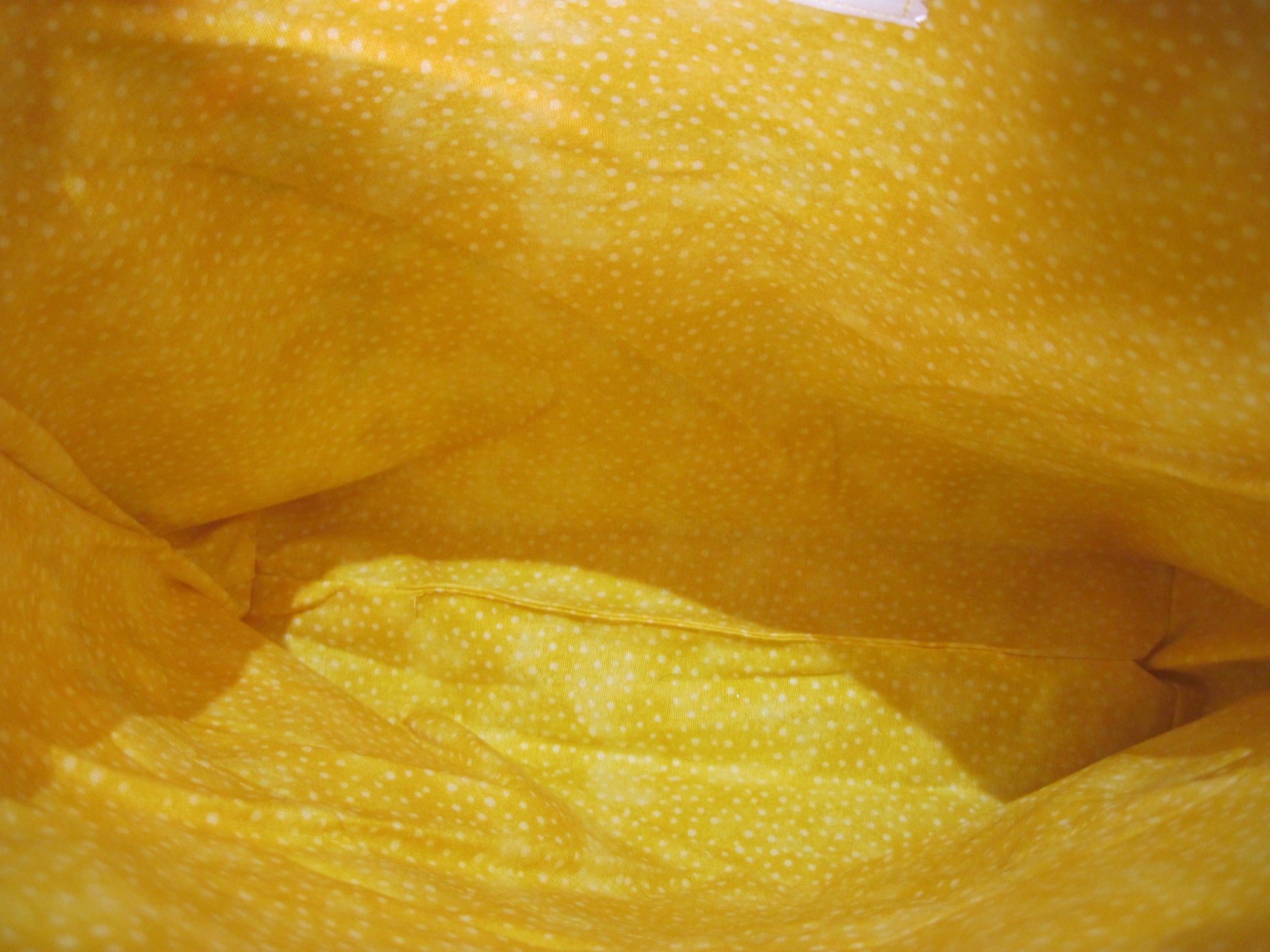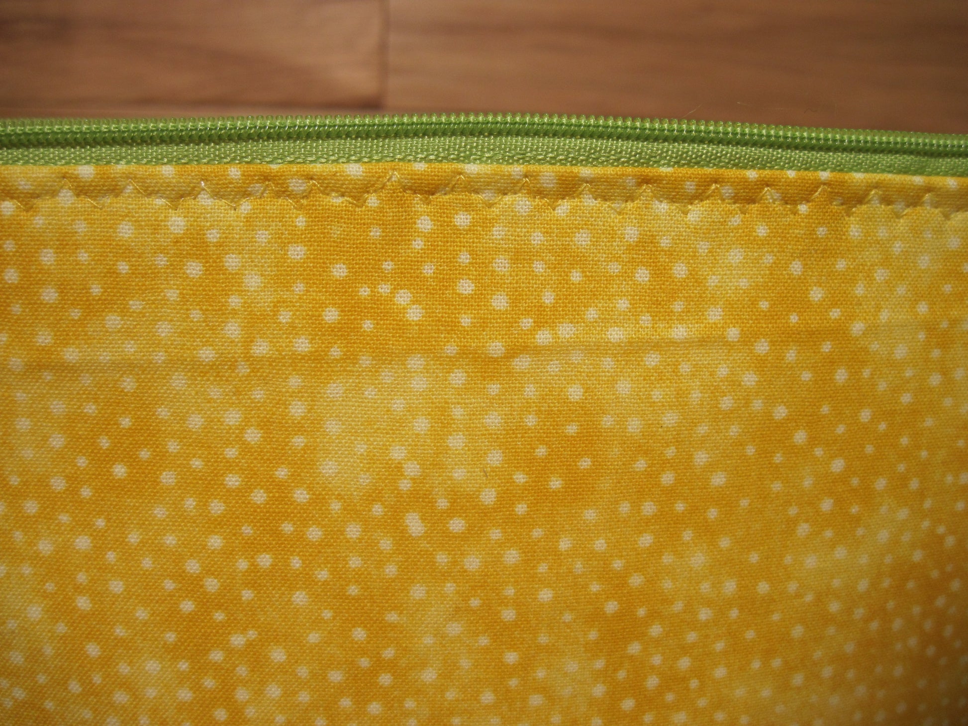 The bag has a zippered top to allow you to keep your items securely inside the bag. There is a key ring inside to keep progress keepers and stitch markers on. On the outside there is a key ring tag with a lobster clasp wristlet. The bag is fully lined with medium weight interfacing between to allow it to stand upright.