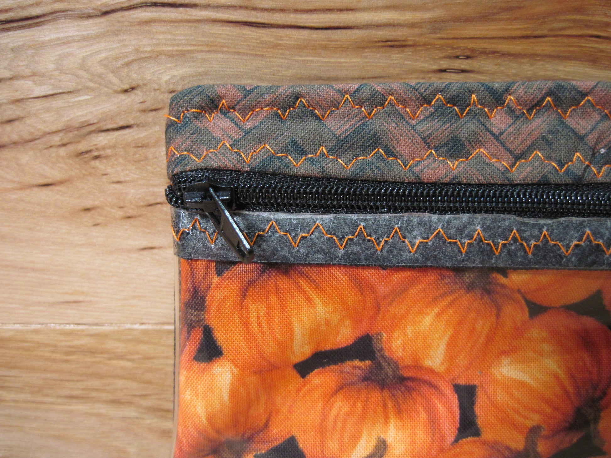 Notions Bag ~ Pumpkins w/ brown basket weave fabric & zipper