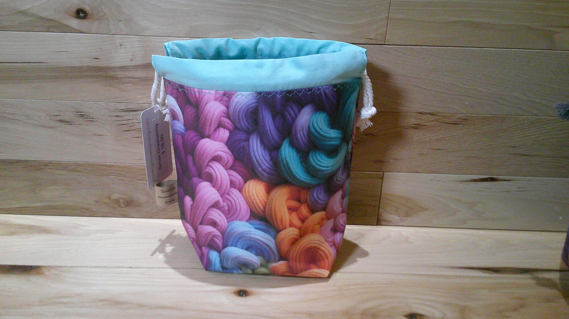 The medium drawstring bag has 2 drawstrings that can be pulled from both sides to close the bags. This bag has a stitch marker ring on the inside of the bag. The bag is fully lined with medium weight interfacing between to allow it to stand upright.
