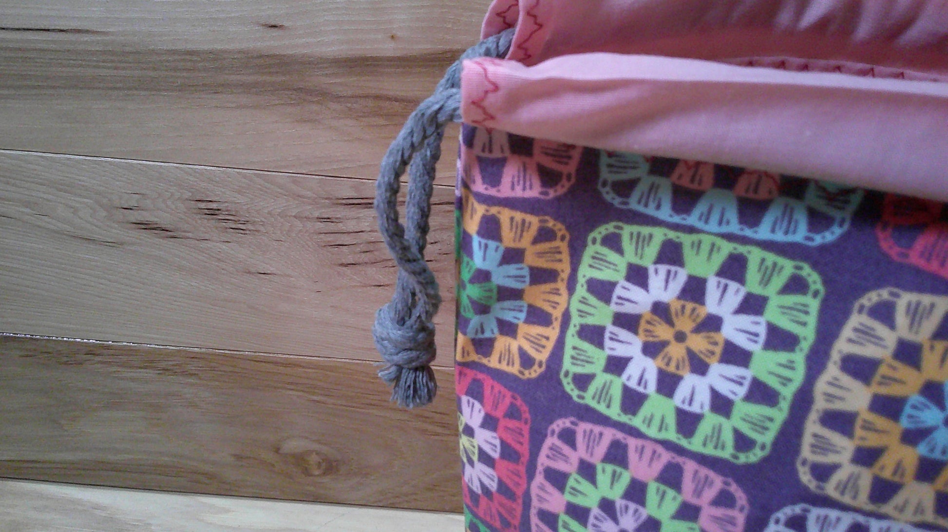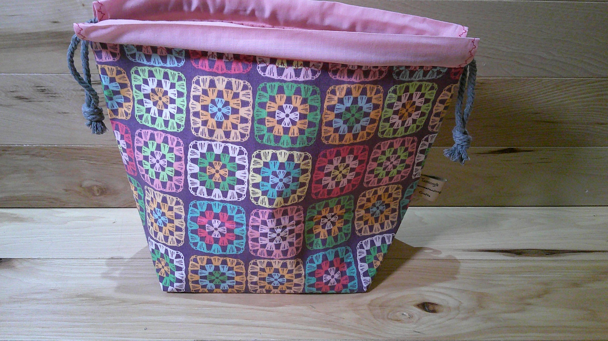 The medium drawstring bag has 2 drawstrings that can be pulled from both sides to close the bags. This bag has a stitch marker ring on the inside of the bag. The bag is fully lined with medium weight interfacing between to allow it to stand upright.