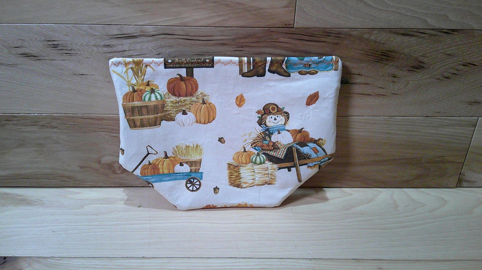 The small notions size bag to keep things like scissors, stitch markers, progress keepers, tape measure and other little things you might need for your projects. There is a D-ring on the inside to hold stitch markers. This bag has a zipper on the front top and a vinyl front so you can see what is in your bag.