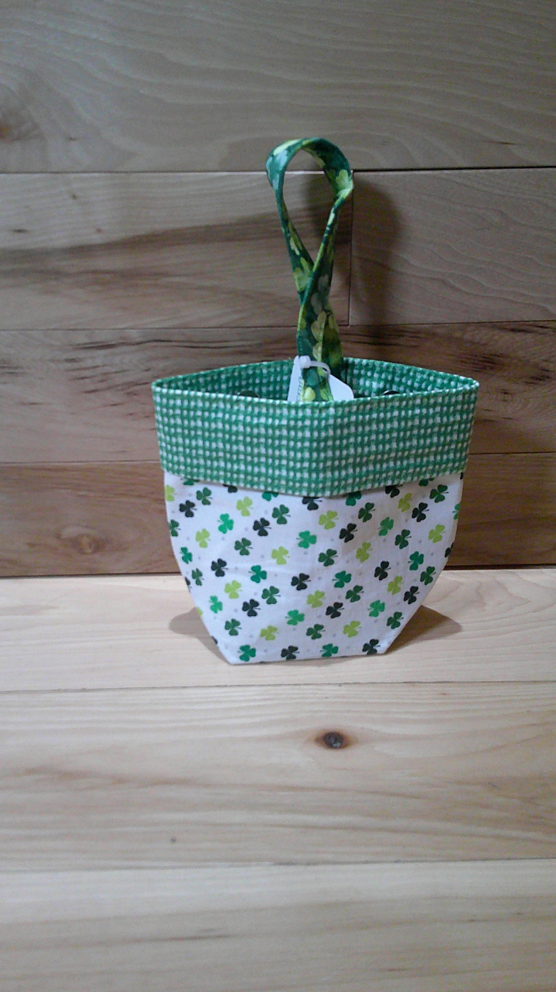 The small drawstring bag has 2 drawstrings that can be pulled from both sides to close the bags. This bag has a stitch marker ring on the inside of the bag. The bag is fully lined with medium weight interfacing between to allow it to stand upright.