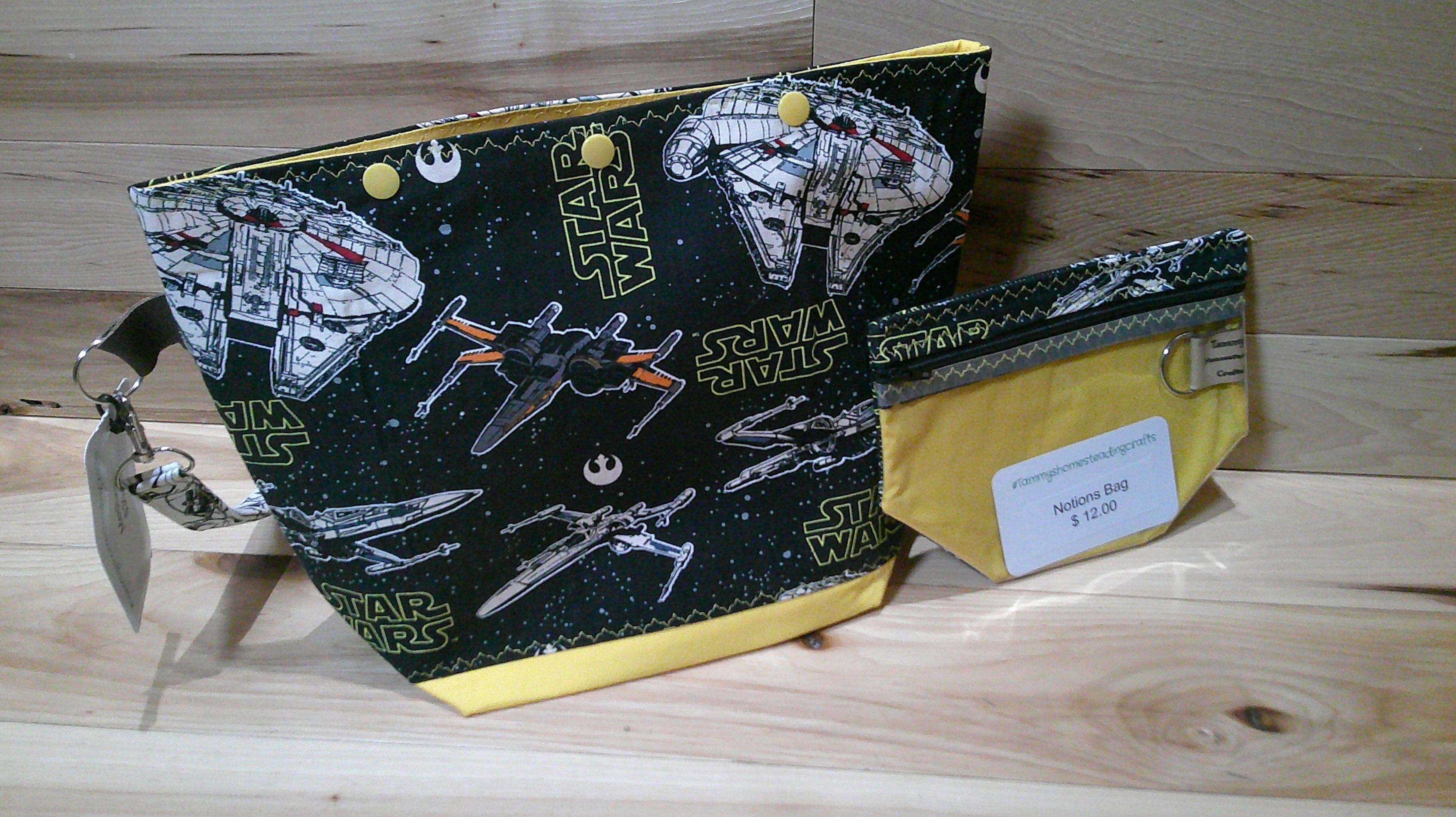 The small notions size bag to keep things like scissors, stitch markers, progress keepers, tape measure and other little things you might need for your projects. There is a D-ring on the inside to hold stitch markers. This bag has a zipper on the front top and a vinyl front so you can see what is in your bag.
