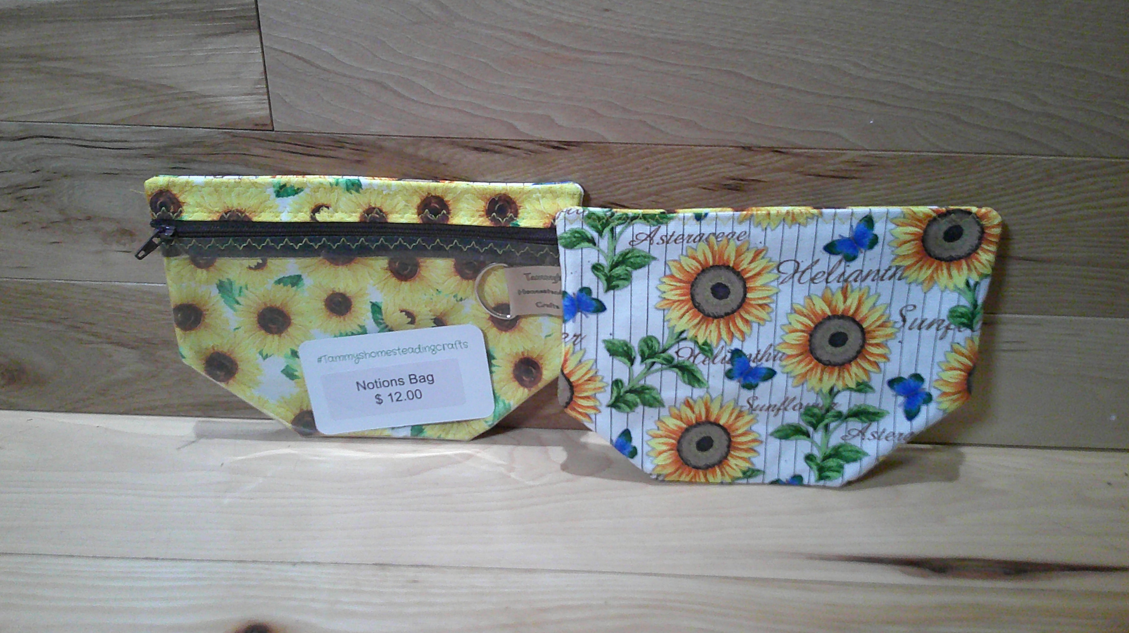 The small notions size bag to keep things like scissors, stitch markers, progress keepers, tape measure and other little things you might need for your projects. There is a D-ring on the inside to hold stitch markers. This bag has a zipper on the front top and a vinyl front so you can see what is in your bag.