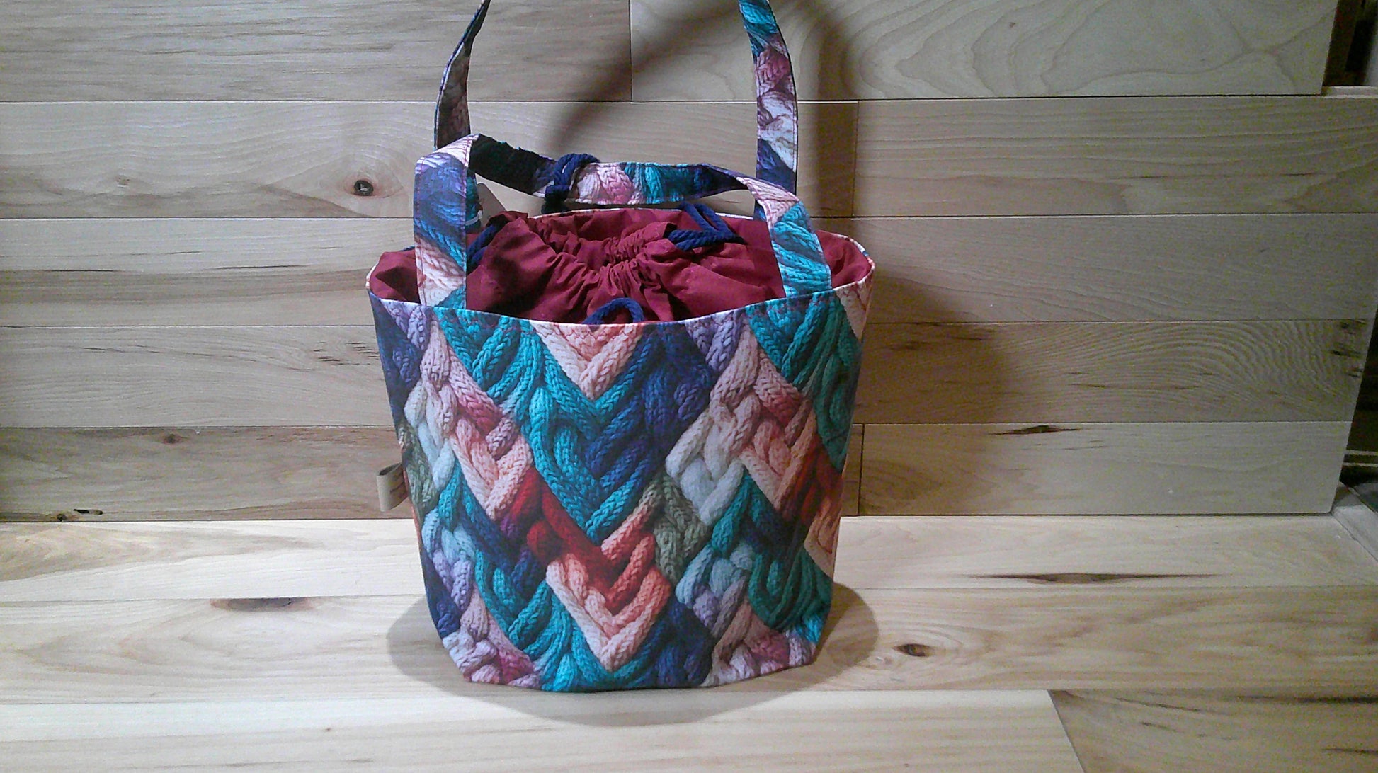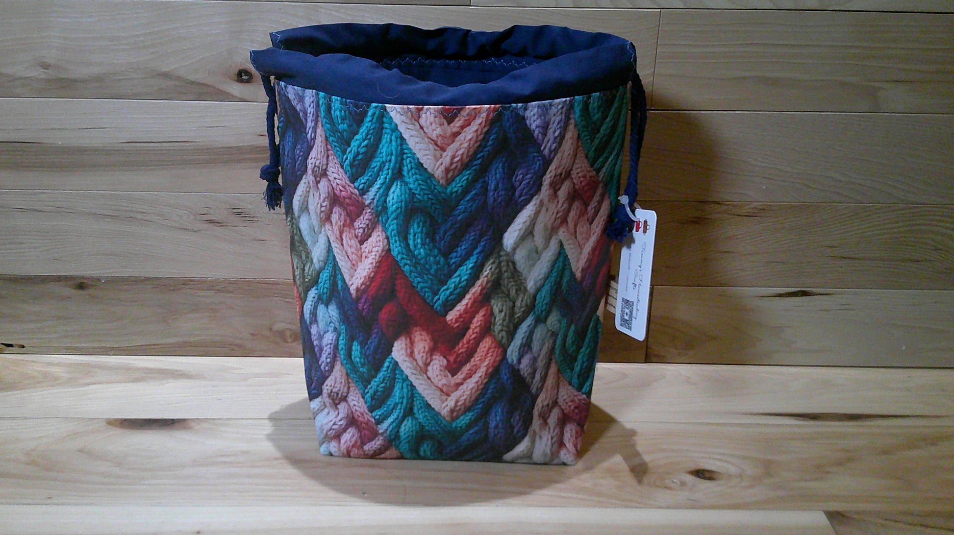 The Large bag size has sewn in handles and a 4-inch top gusset with drawstring for closure. There is a key ring inside to keep progress keepers and stitch markers on. The drawstrings are long enough so you are able to roll the extra top fabric down to make a yarn bowl bag for knitting or crocheting out of. The bag is fully lines with medium weight interfacing between to allow is to stand upright. This bag has 5 pockets on the inside of the bag that are sturdy and make the bag nice and firm.