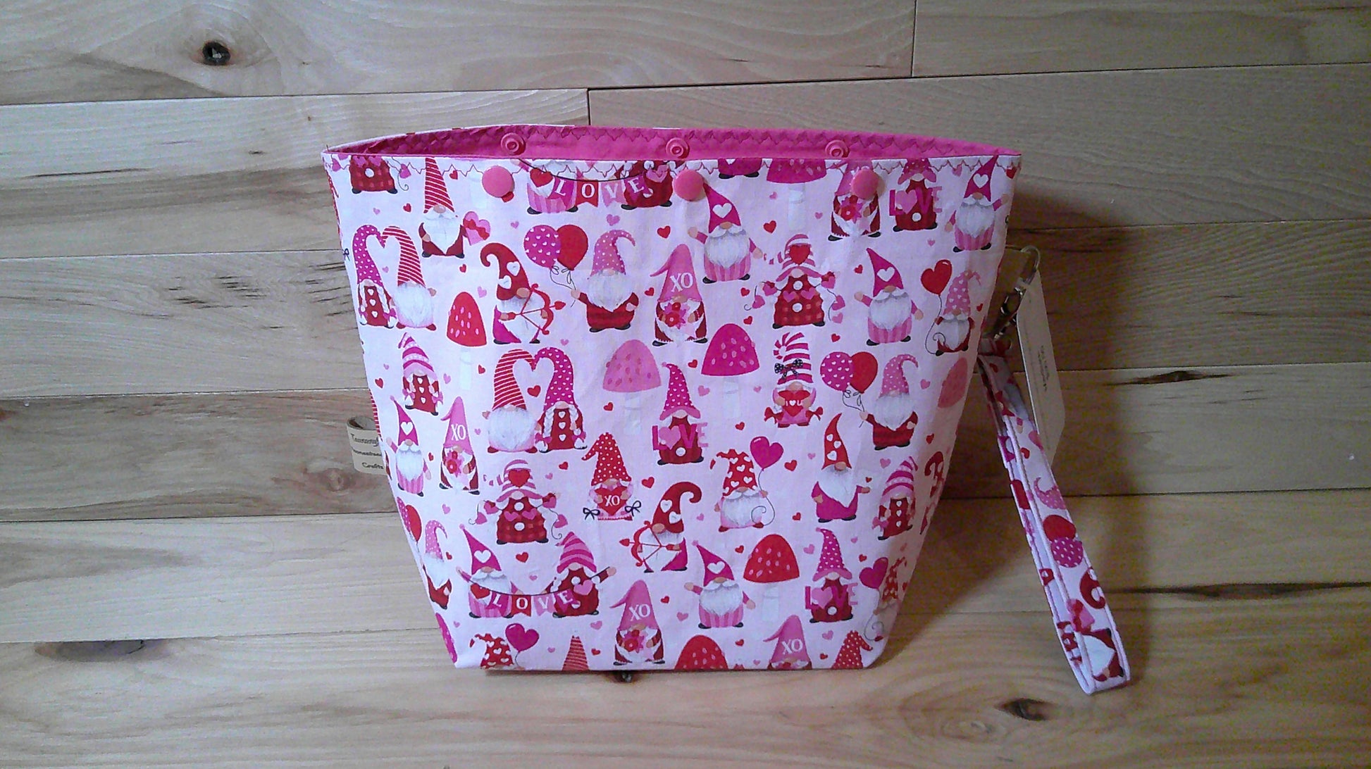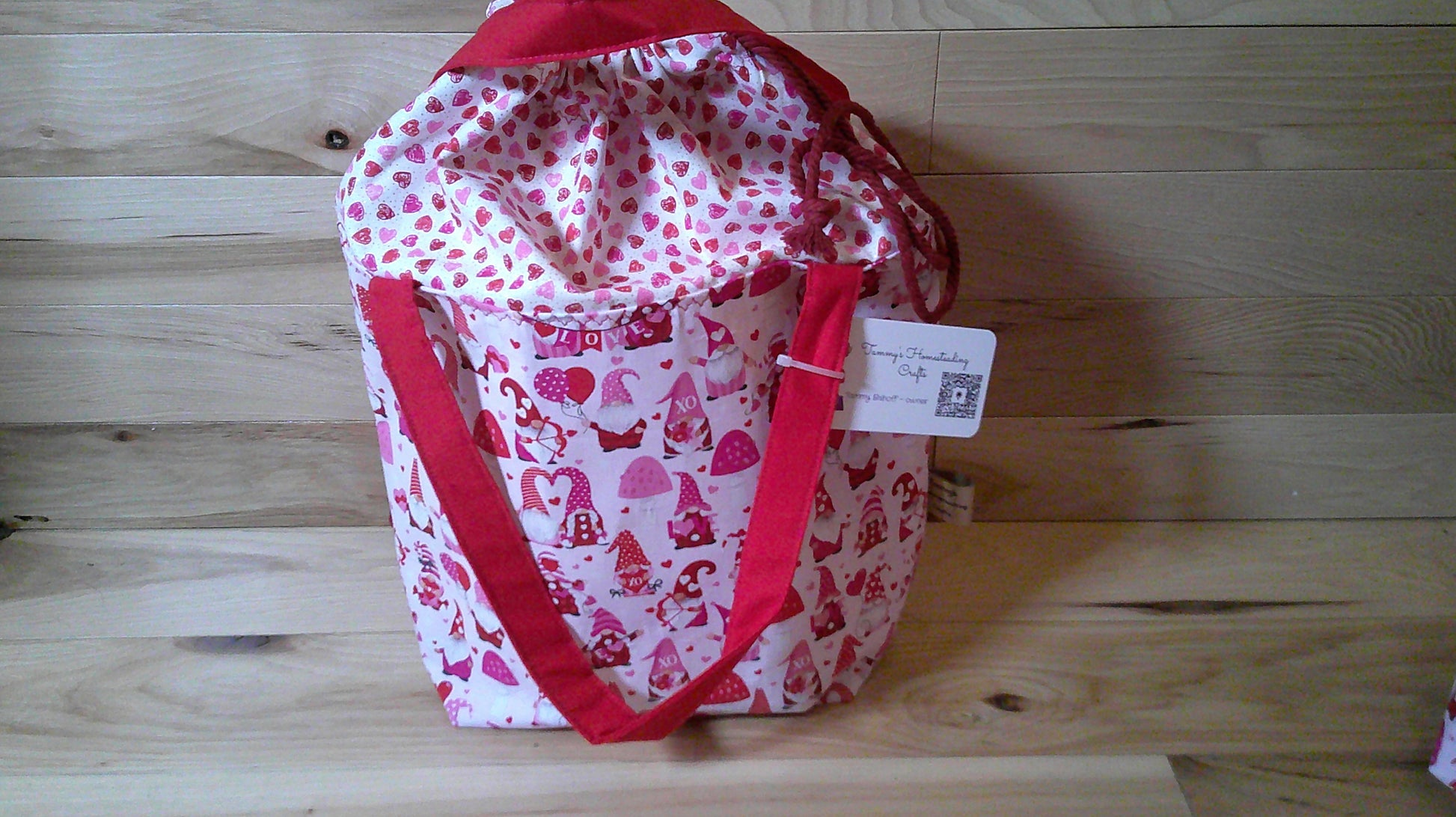 The Large bag size has sewn in handles and a 4-inch top gusset with drawstring for closure. There is a key ring inside to keep progress keepers and stitch markers on. The drawstrings are long enough so you are able to roll the extra top fabric down to make a yarn bowl bag for knitting or crocheting out of. The bag is fully lines with medium weight interfacing between to allow is to stand upright. This bag has 5 pockets on the inside of the bag that are sturdy and make the bag nice and firm.