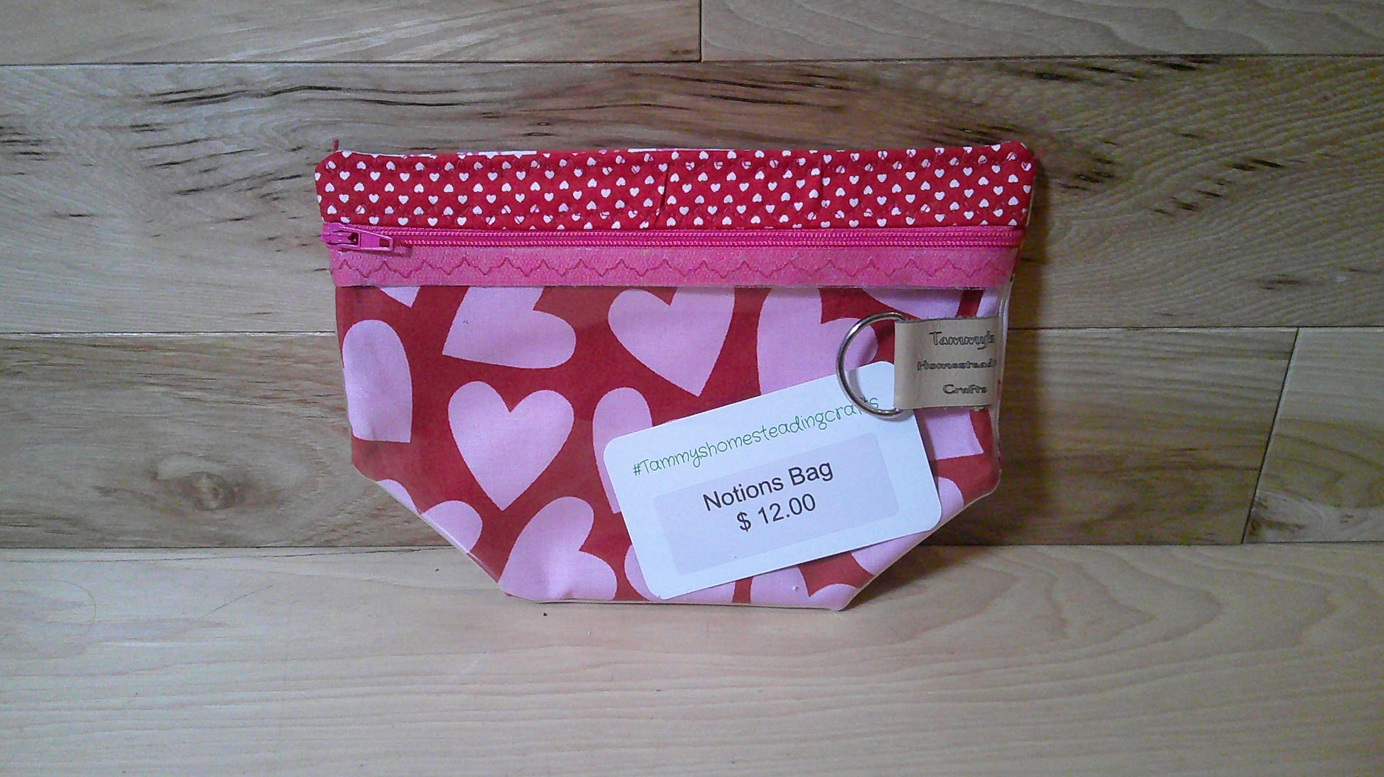 The small notions size bag to keep things like scissors, stitch markers, progress keepers, tape measure and other little things you might need for your projects. There is a D-ring on the inside to hold stitch markers. This bag has a zipper on the front top and a vinyl front so you can see what is in your bag.