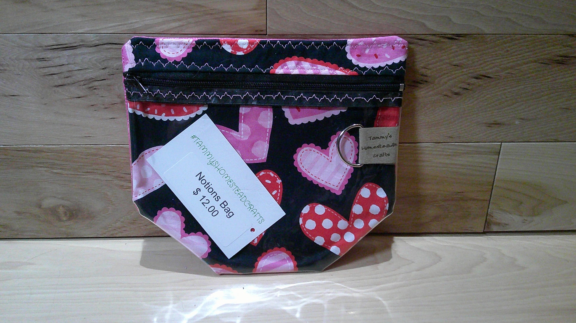 The small notions size bag to keep things like scissors, stitch markers, progress keepers, tape measure and other little things you might need for your projects. There is a D-ring on the inside to hold stitch markers. This bag has a zipper on the front top and a vinyl front so you can see what is in your bag.