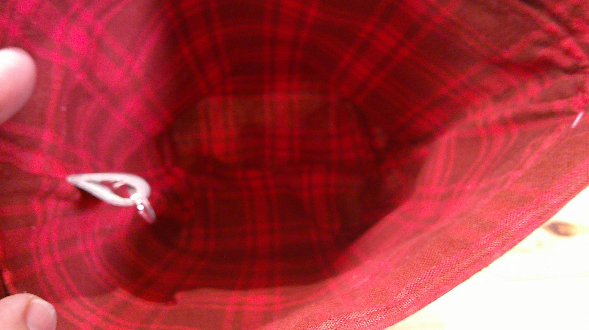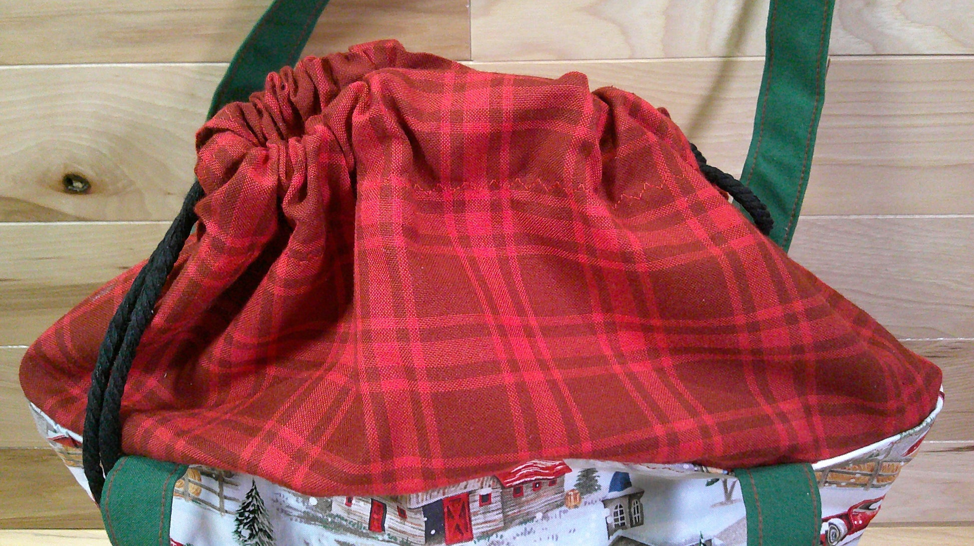 The medium drawstring bag has 2 drawstrings that can be pulled from both sides to close the bags. This bag has a stitch marker ring on the inside of the bag. The bag is fully lined with medium weight interfacing between to allow it to stand upright.