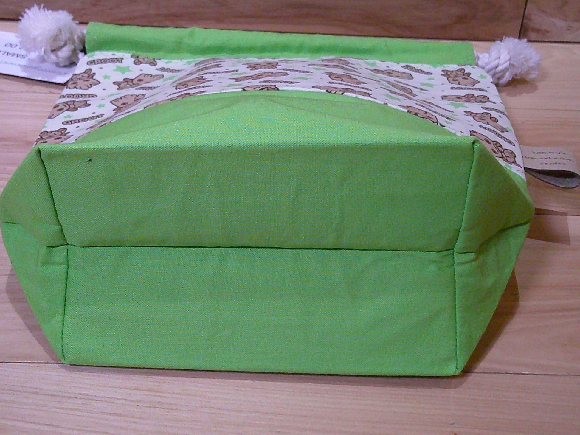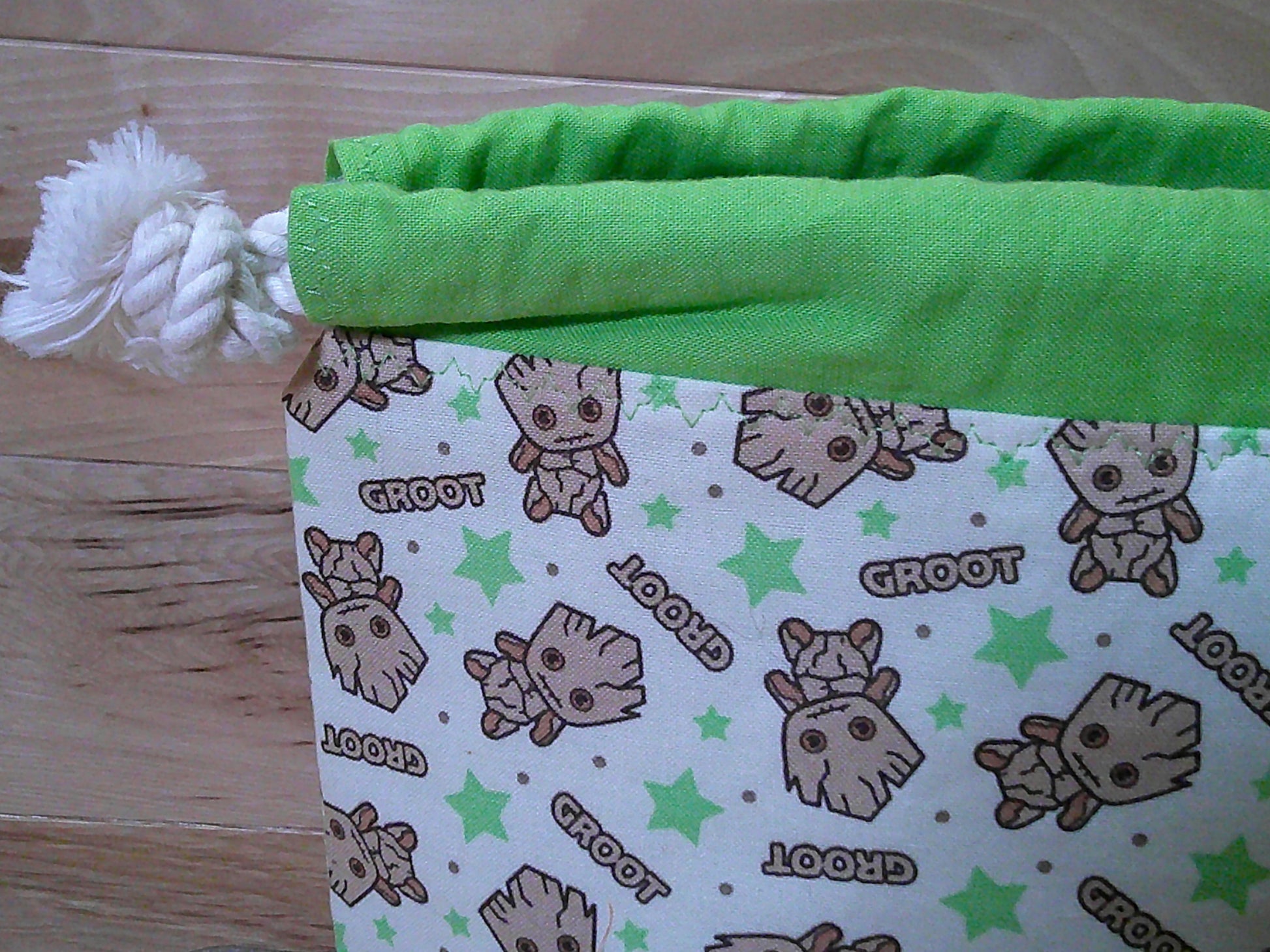 The small drawstring bag has 2 drawstrings that can be pulled from both sides to close the bags. This bag has a stitch marker ring on the inside of the bag. The bag is fully lined with medium weight interfacing between to allow it to stand upright.