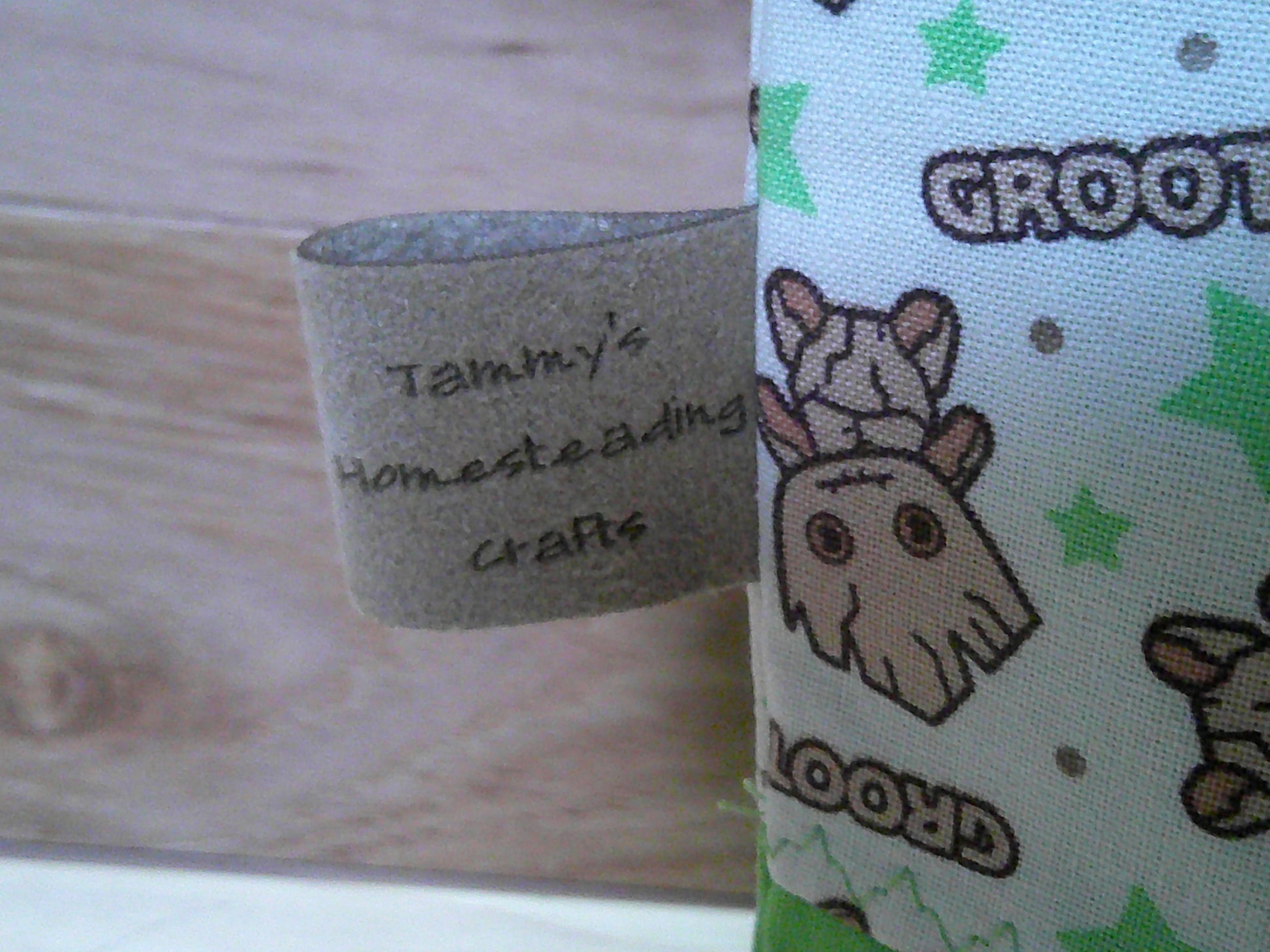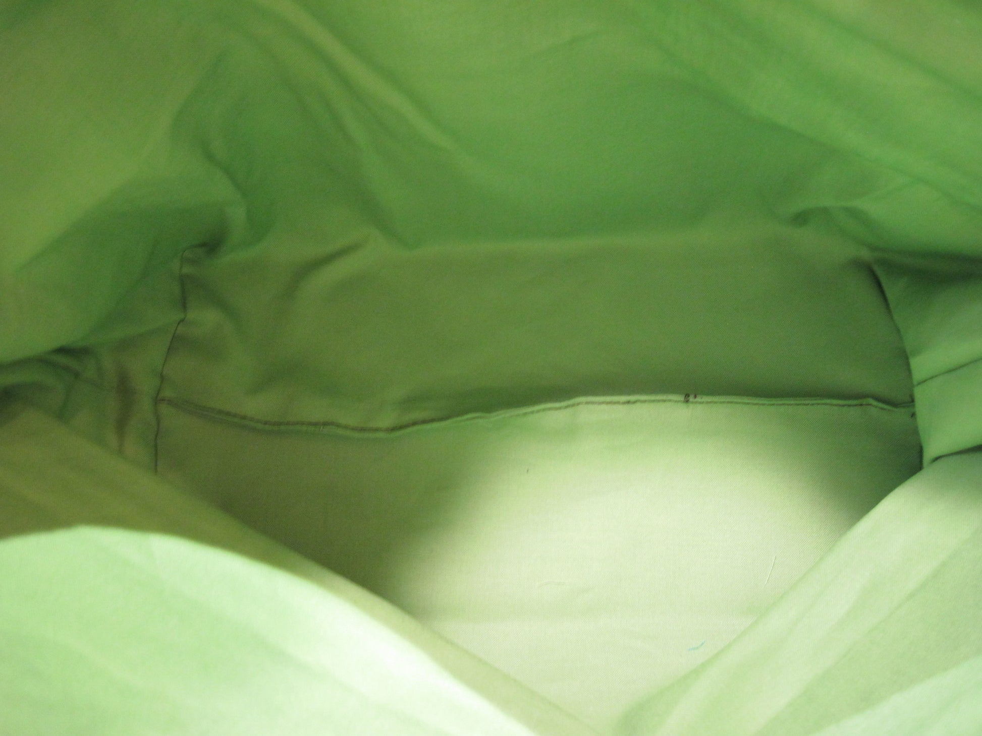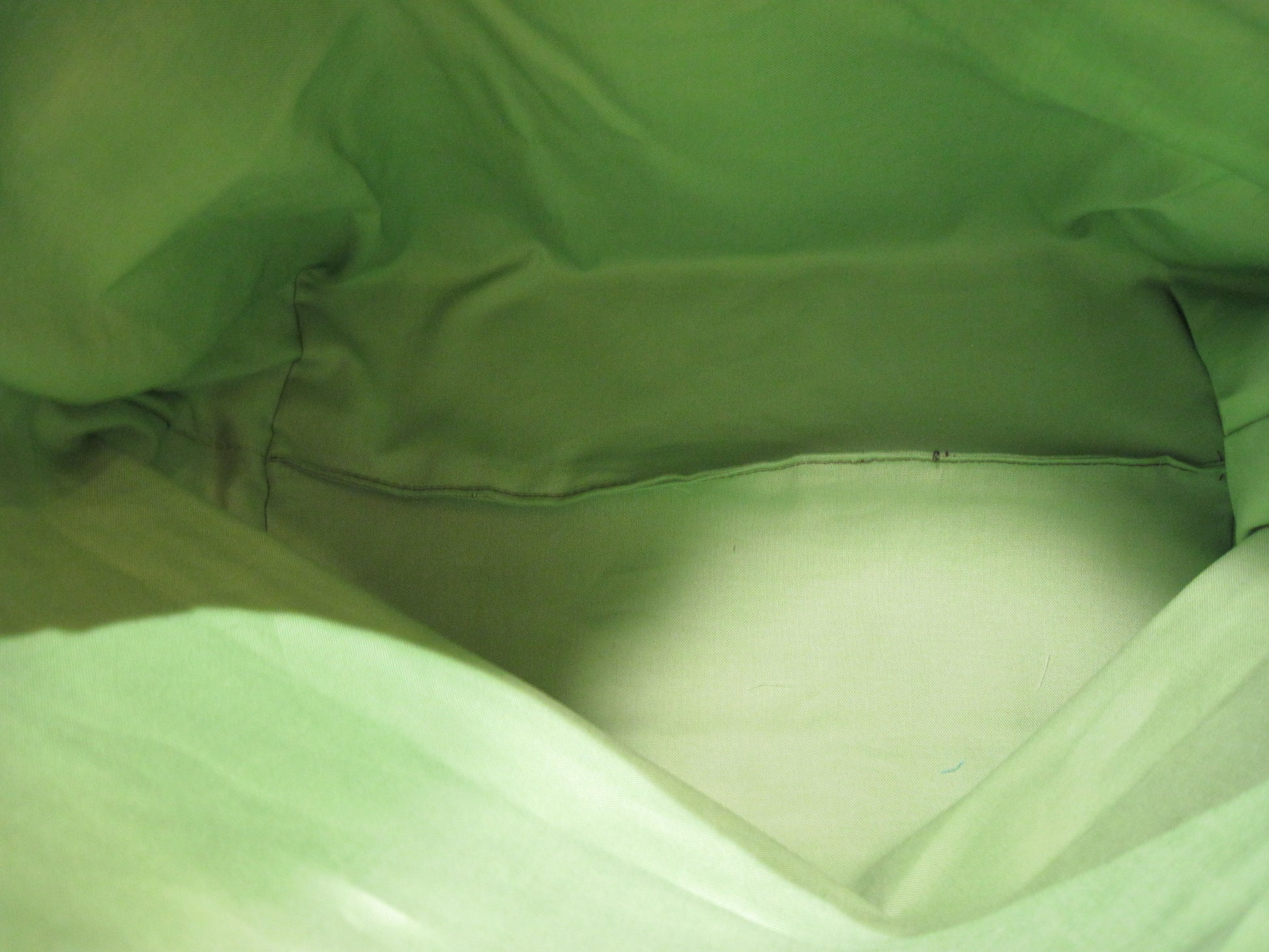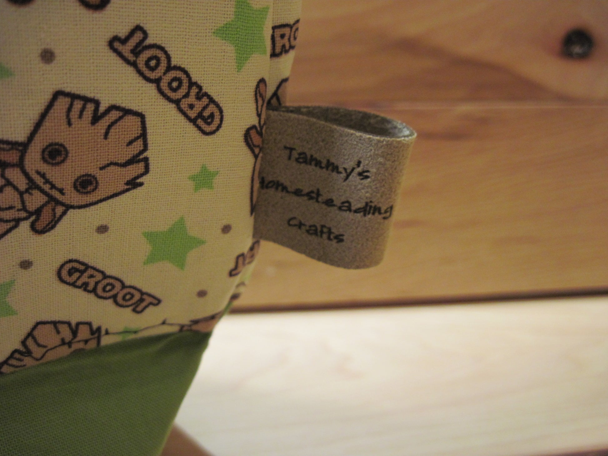 The X-large bag has snaps top to allow you to keep your items securely inside the bag. This bag also has removeable handles with snaps. There is a key ring inside to keep progress keepers and stitch markers on. On the outside there is a key ring tag with a lobster clasp wristlet. The bag is fully lined with medium weight interfacing between to allow it to stand upright.